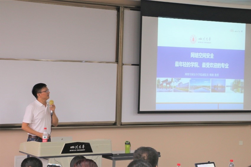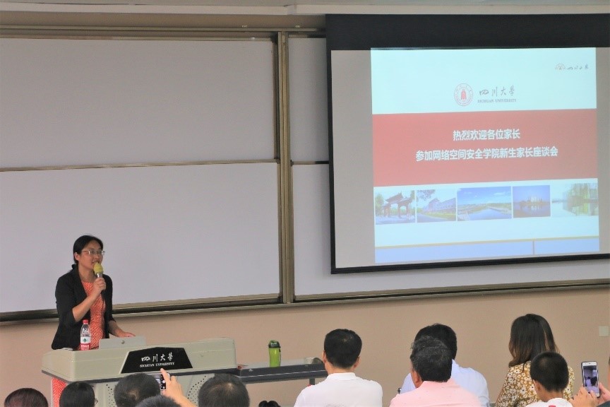 随后,由杨频老师讲话。杨老师通过简明扼要的语言以及生动的实例,向学生家长们介绍了网络空间安全的基本知识及其重要性,接着杨老师给家长们详细介绍了学院和专业培养特色。