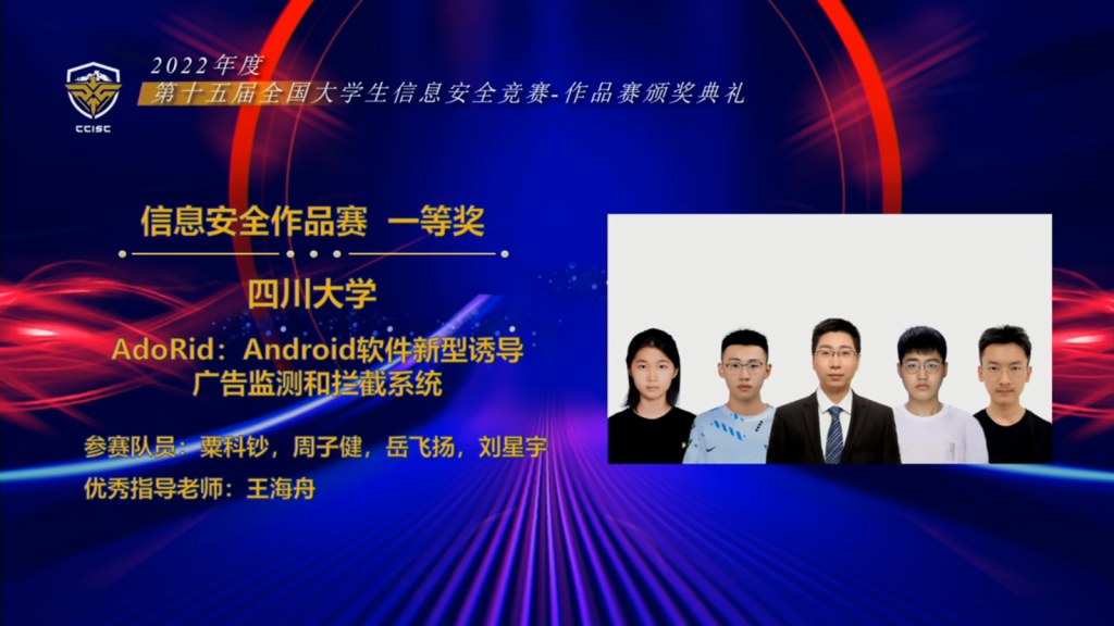 8月22日,第十五届全国大学生信息安全竞赛(作品赛)获奖名单正式揭晓。pg娱乐电子官网本科生在本次竞赛中再创佳绩,斩获全国最具创业价值奖2项(全国共10项,该奖项获奖队伍数在所有参赛高校中并列第一)、全国一等奖2项、全国二等奖5项、全国三等奖1项。王海舟、黄诚两位老师荣获优秀指导教师奖。尤其值得一提的是获得最具创业价值奖的项目“AdoRid:Android软件新型诱导广告监测和拦截系统”是由2020级(大二)网安少年生为主完成的项目。