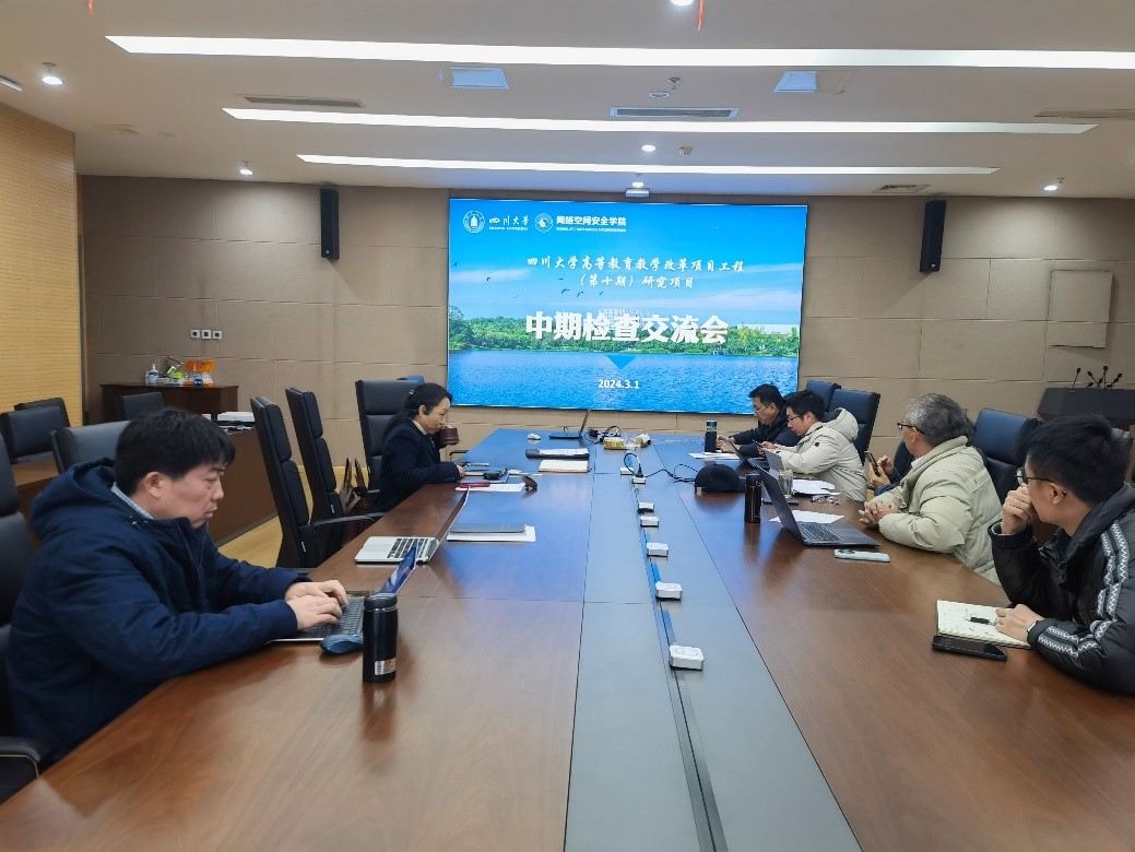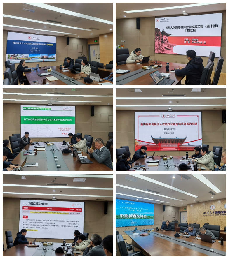 接着,pg娱乐电子官网5位项目负责人陈兴蜀教授、王海舟副教授、何俊江老师、张意教授、黎红友老师依次汇报了项目的实施情况,包括项目拟解决的问题、中期已完成的内容及进展情况、已取得的阶段性成果、成果创新点和应用、下阶段计划与预期成果等。其中陈兴蜀教授负责的“网安拔尖人才实践能力协同培养机制探索”和黎红友老师负责的“大学生真实情况精准把握策略研究—基于高校辅导员与专业课教师的协同”两项被评为优秀项目。