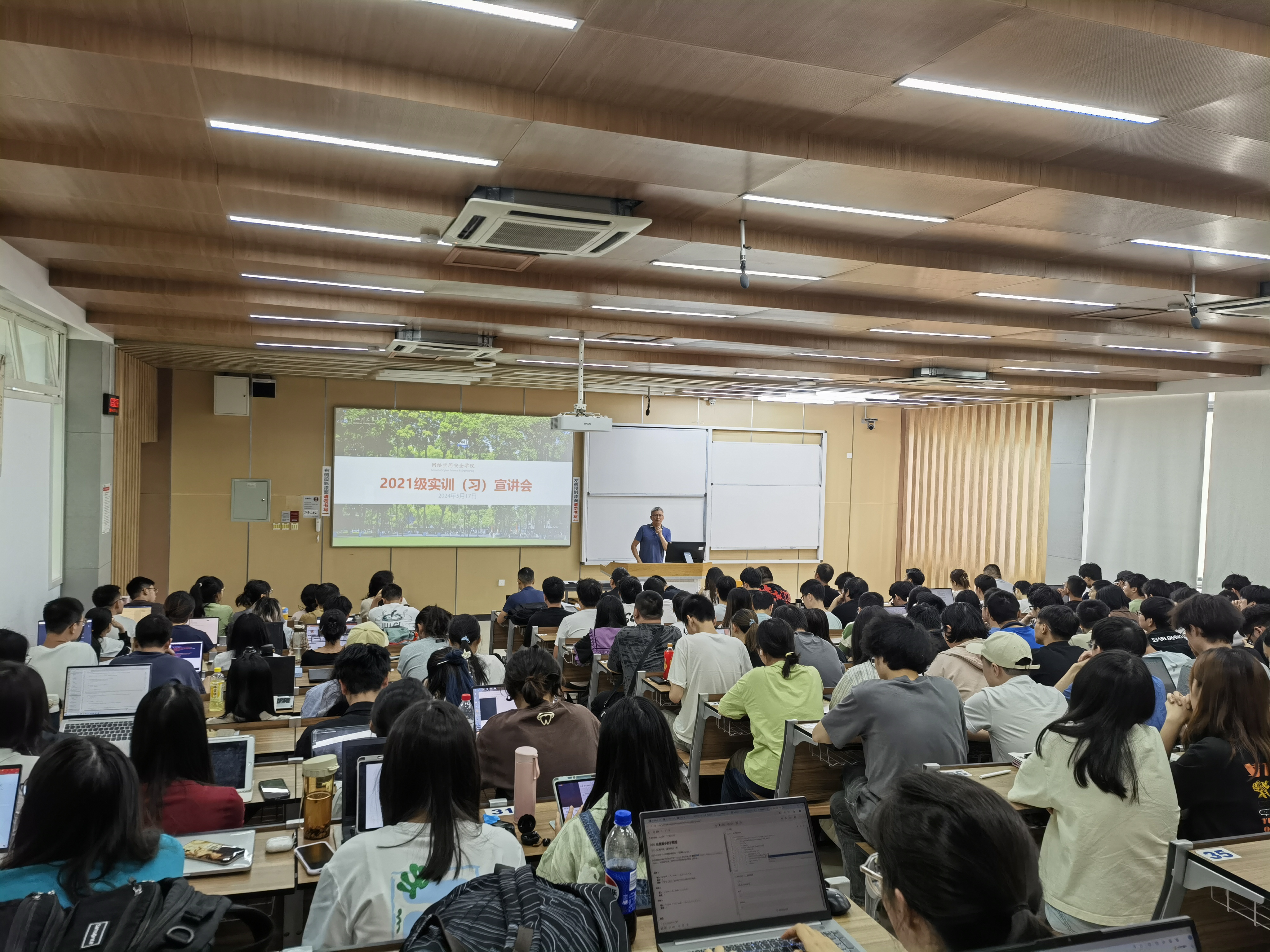 为增强学生实践动手能力,提高毕业生就业竞争力,pg娱乐电子官网于5月17日在pg娱乐电子游戏官网入口江安校区综合楼C座403教室举行2021级本科生实习动员宣讲会。pg娱乐电子官网邀请到了成都国信安信息产业基地有限公司、绿盟科技集团股份有限公司、成都肆零肆网络科技有限公司、四川天融信教育科技有限公司、成都无糖信息技术有限公司、成都知了汇智科技有限公司等六家行业知名企业负责人到场,pg娱乐电子游戏官网入口副院长杨频、2021级辅导员老师、本科教学科老师以及2021级全体学生出席了宣讲会,会议由学院副院长杨频主持。