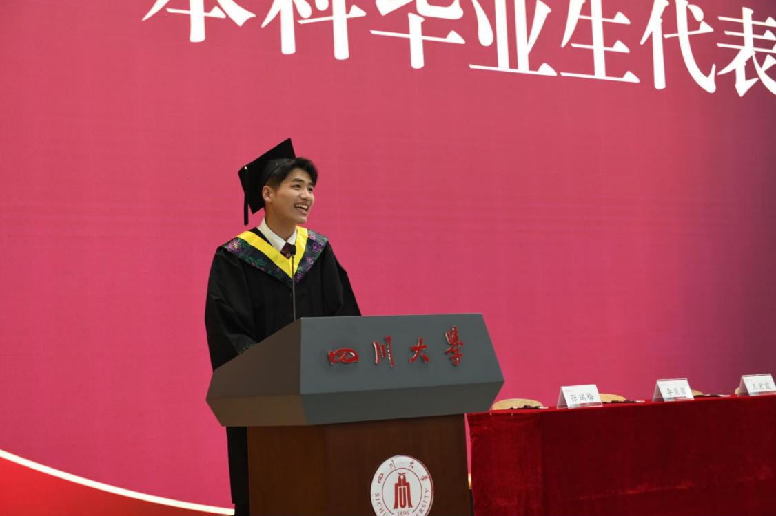 随后,本科毕业生代表粟科钞同学、硕士毕业生代表罗冰菱依次上台发言。他们回顾了在校的学习生活,表达了对母校和老师的感激之情,同时,他们也分享了自己的学习心得和成长经历,激励在场的同学们勇往直前,追求卓越。