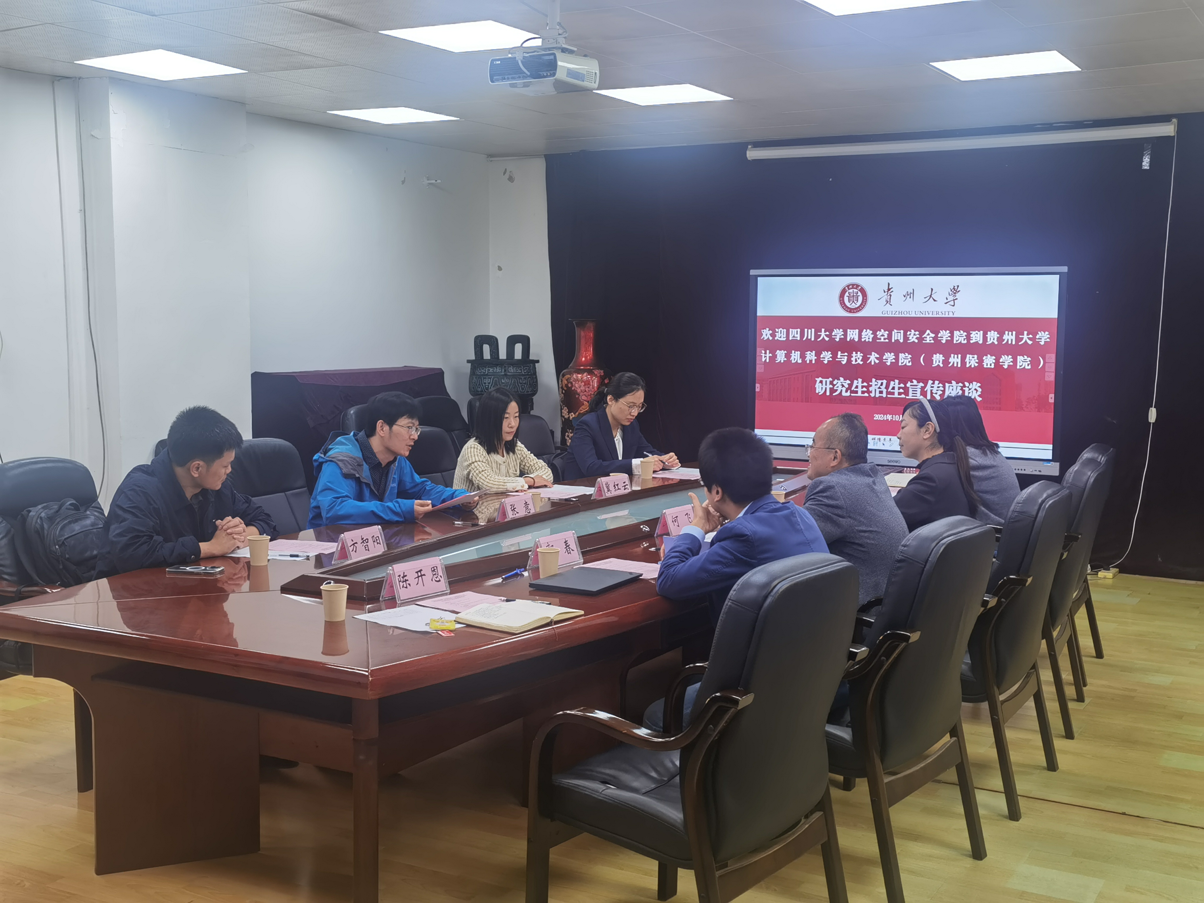 10月17日,pg娱乐电子官网党总支副书记兼副院长张意一行赴贵州大学计算机科学与技术学院(贵州保密学院)开展研究生招生宣传座谈。座谈由贵州大学计算机科学与技术学院(贵州保密学院)党委副书记何飞主持。计算机科学与技术学院(贵州保密学院)郭春、牛坤、陈开恩、李模弋等4名教师和20余名学生,pg娱乐电子官网李晓慧、方智阳和冀红云等3名教师参加座谈。
