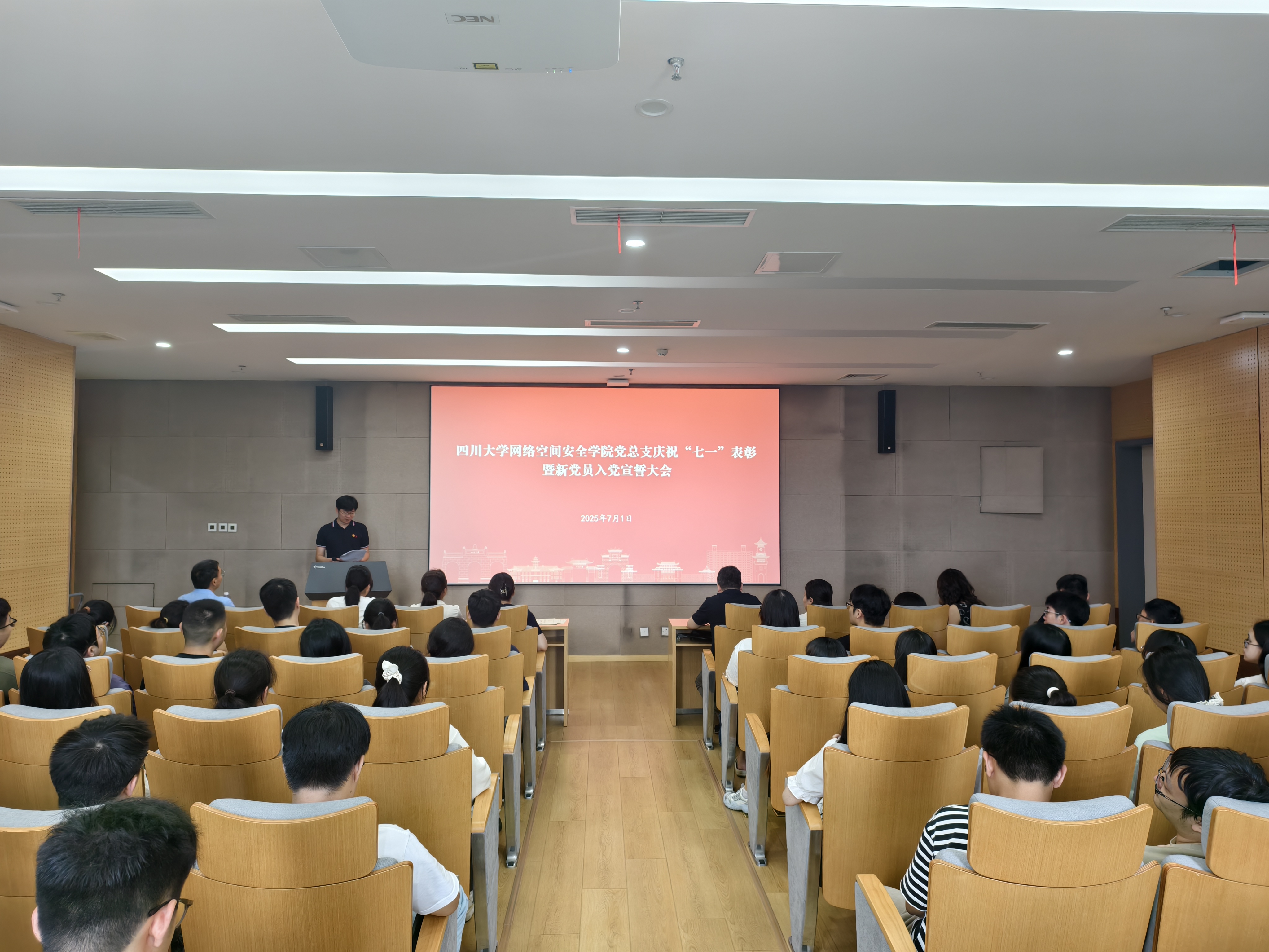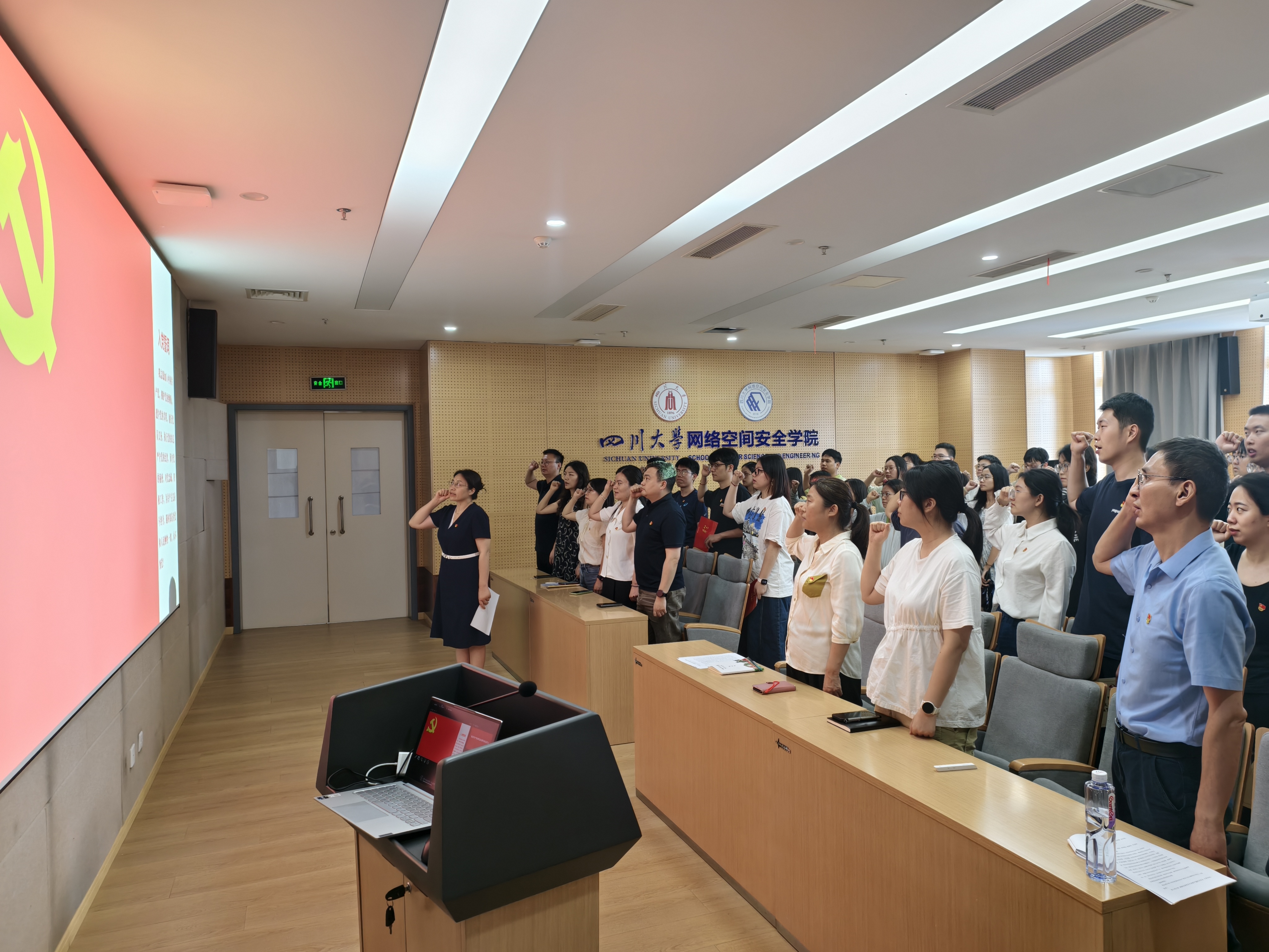 7月1日下午,pg娱乐电子游戏官网入口在江安校区多学科交叉研究创新大楼919会议室举行庆祝“七一”表彰暨新党员入党宣誓大会。学院党总书记秦燕、党总支副书记兼副院长张意,党总支全体委员,专职组织员,各党支部书记及支委,全体辅导员,受表彰的先进党支部代表、优秀共产党员和优秀党务工作者、以及2024年下半年和2025年上半年新发展的党员参加大会,张意主持大会。