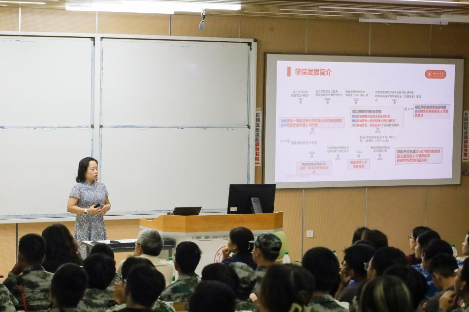 典礼在庄重的氛围中拉开帷幕。首先,学院院长陈兴蜀发表讲话。她代表学院全体师生对新生的到来表示热烈欢迎,并结合当前国家网络安全战略需求与学院发展历程,向新生们介绍了学院在网络空间安全领域的学科优势。同时,陈院长对新生提出殷切期望,鼓励大家在大学期间既要扎实掌握专业知识,培养创新思维,也要积极参与实践活动,提升综合素养,树立远大理想,以昂扬的姿态迎接未来的挑战,努力成长为符合时代需求的优秀人才。