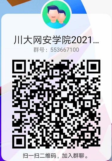 报考者请加入“川大网安2021推免硕士”QQ群(群号:553667100,也可扫描以下二维码进入),该群需实名认证,认证方式是“姓名-学校”。