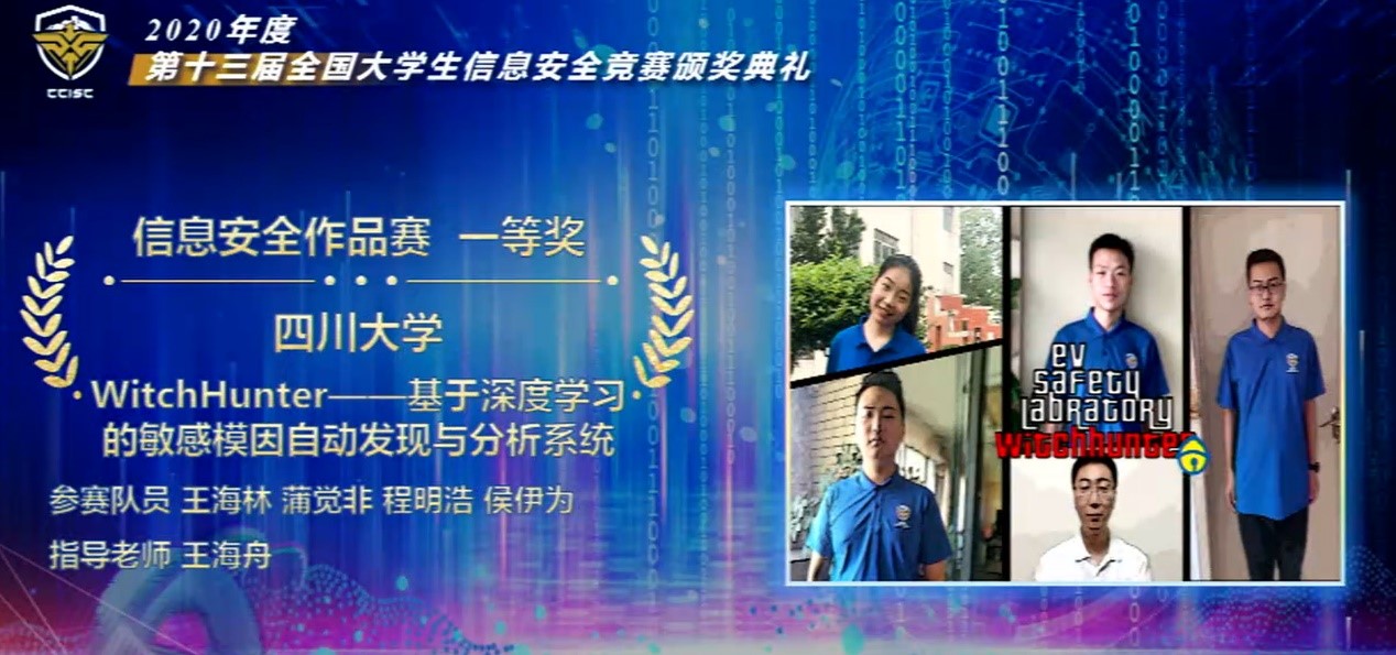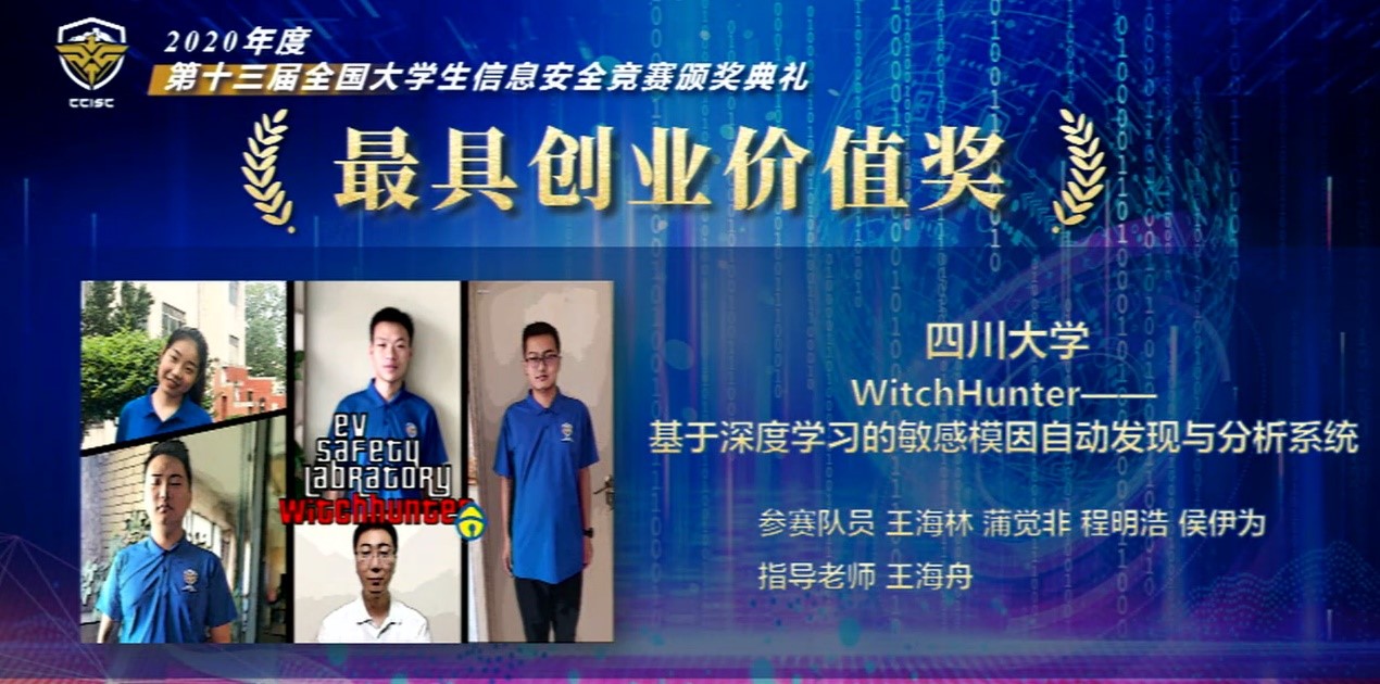 8月19日,第十三届全国大学生信息安全竞赛(作品赛)获奖名单正式揭晓。pg娱乐电子官网学子在本次竞赛中再创佳绩,斩获全国一等奖2项、二等奖3项、三等奖1项。其中一等奖项目“WitchHunter-基于深度学习的敏感模因自动发现与分析系统”还获得了本次大赛特别设立的“最具创新创业价值奖”。pg娱乐电子游戏官网入口荣获优秀组织奖(共八所高校,位列第一),王海舟、黄诚两位老师荣获优秀指导教师奖。