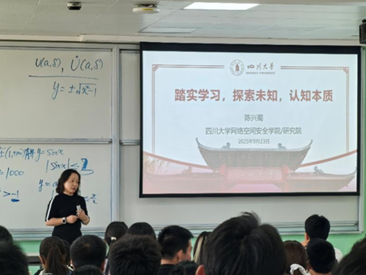 9月23日,网络安全学院院长陈兴蜀教授以“踏实学习,探索未知,认知本质”为主题,为学院2025级本科新生讲授开学第一课。本次活动旨在引导新生树立清朗学风,激发科研热情,为他们即将展开的大学生涯奠定坚实的思想与行动基础。