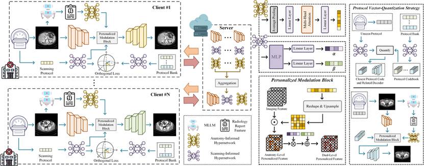 针对这些低剂量CT成像领域的关键问题,pg娱乐电子游戏官网入口张意教授团队对成像的物理过程进行思考,并提出通过设计双重物理驱动的个性化联邦CT成像框架(《Patient-Level Anatomy Meets Scanning-Level Physics: Personalized Federated Low-Dose CT Denoising Empowered by Large Language Model》)该论文通过实现通过引入对影响低剂量CT的解剖和扫描的相关物理特征实现切片级的个性化成像。具体而言,该方法通过引入医疗大模型,对解剖信息进行提取对成像特征的空间信息进行调制,并且通过设计超参网引入几何参数对成像特征进行正则化调制。实验结果表明,该方法可以在不同低剂量策略上均取得较好的重建效果,并且可以与不同的成像网络进行结合,具有较好的泛化能力。该成果被CVPR 2025录用,该成果联合东南大学、复旦大学合作完成,2021级博士生杨子元为第一作者,张意教授为通信作者。