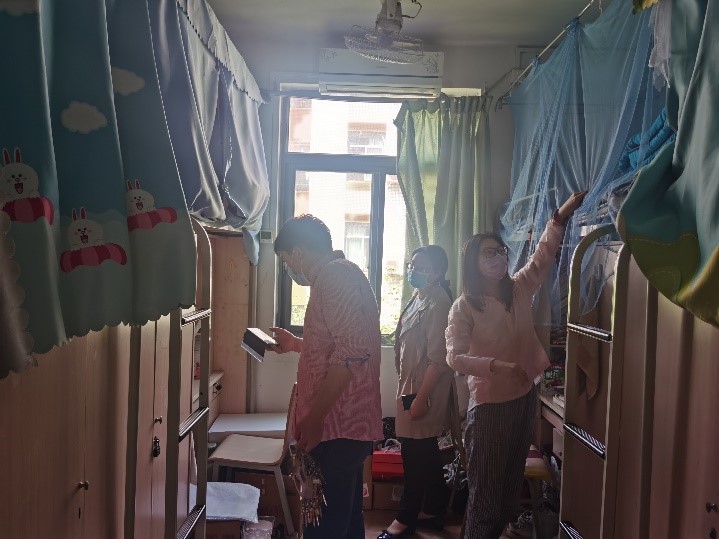 4月28日早上9点钟,学院领导和辅导员老师到达了学生寝室,对学院的学生寝室开展逐一检查,检查学生寝室电路、水路安全以及门窗是否破损,配合宿舍管理员做好学生寝室内消毒等相关工作。