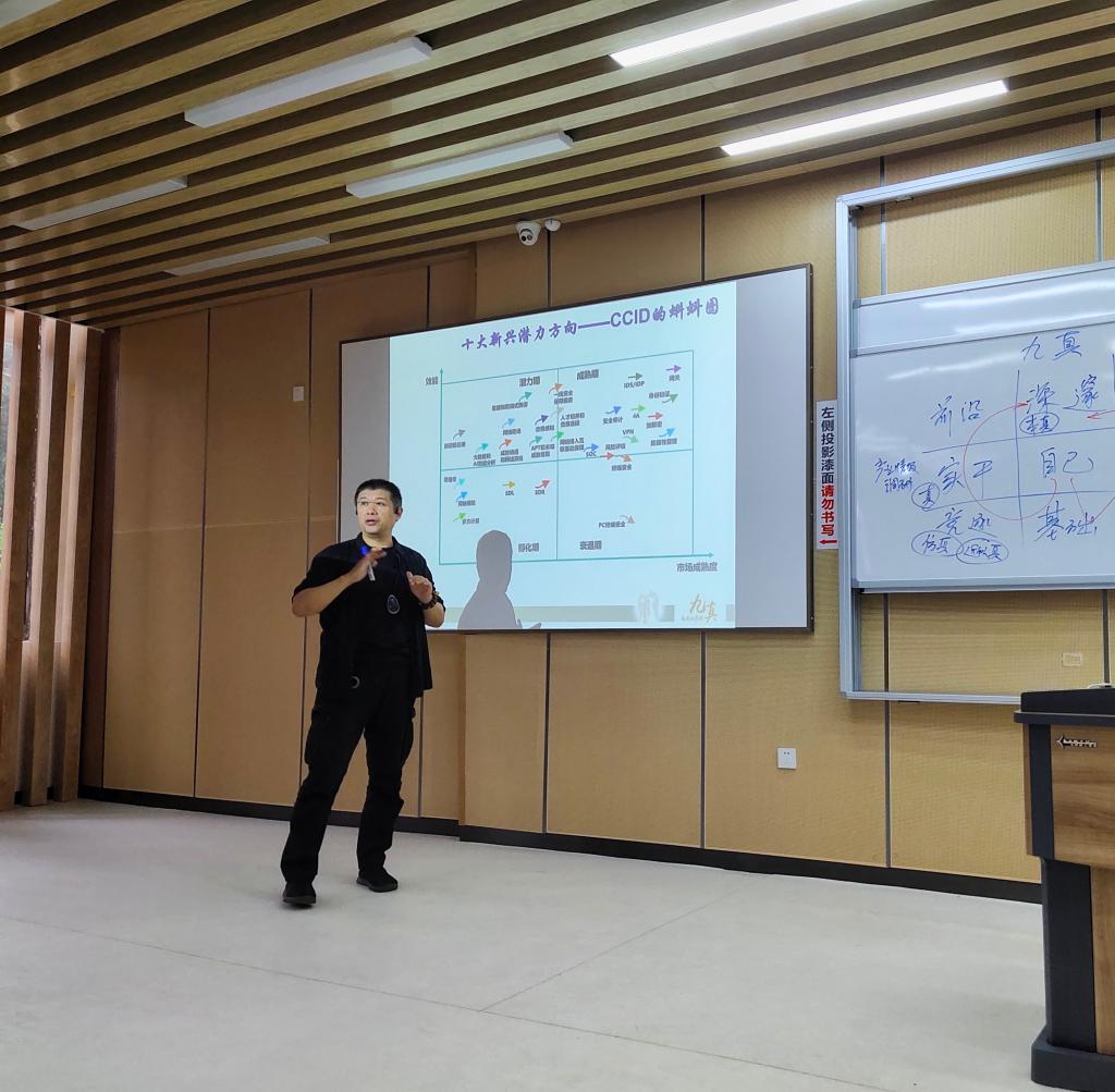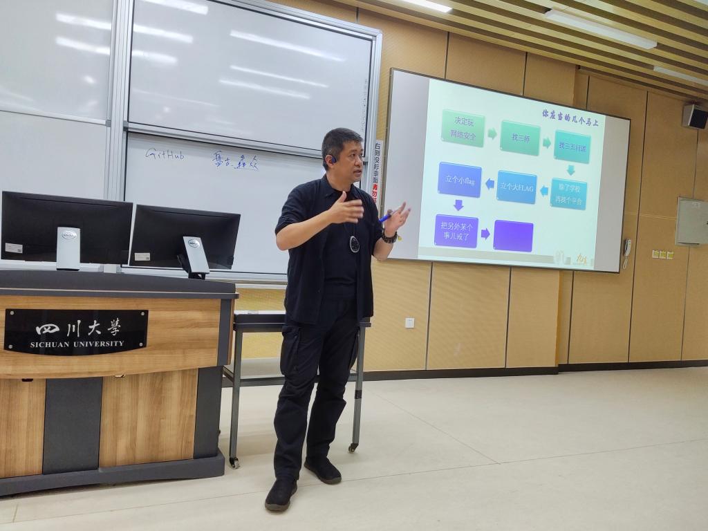首先,网络空间全学院常务副院长陈兴蜀教授为大家介绍了潘柱廷老师。潘柱廷老师,业界常称“大潘”,教授级高级工程师。现任安天科技集团资深副总裁,北向峰汇创始人。长期从事信息安全技术、产品管理、战略研究和教育工作,并在相关领域取得了杰出的成就。