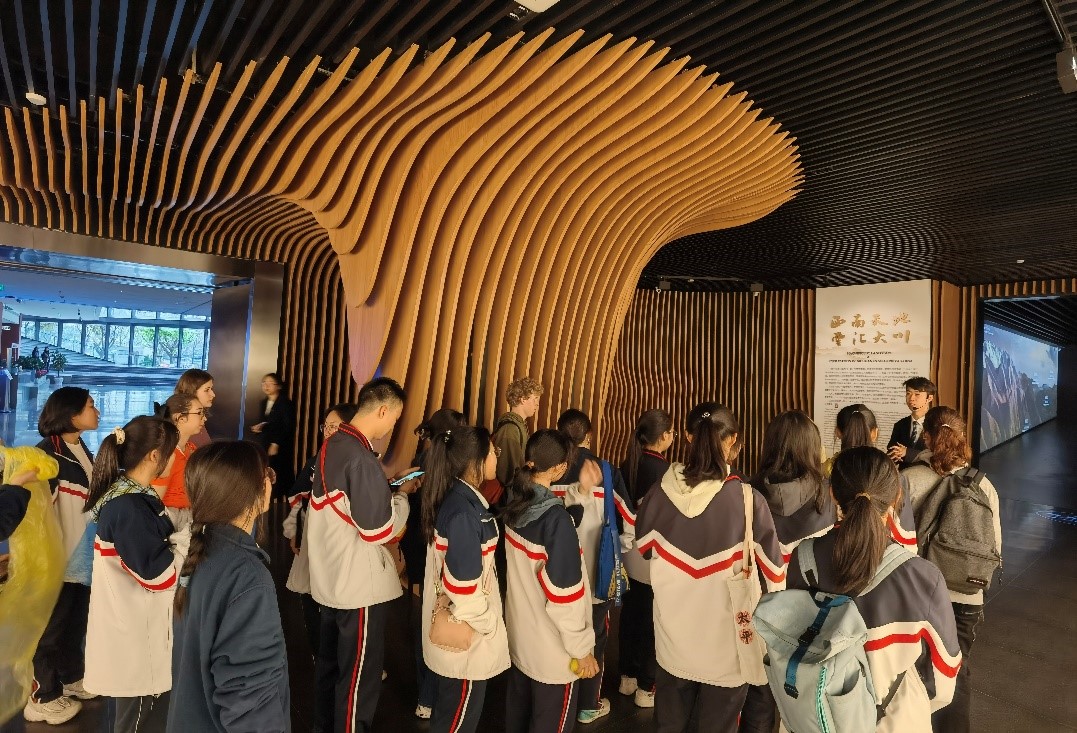 pg娱乐电子游戏官网入口本科教学科何露老师陪同中法师生从学校北门步行到东门,沿途参观了大红门、双荷池、基础教学楼、校史馆、江姐纪念馆等景观,最终来到全新建成的pg娱乐电子游戏官网入口博物馆进行研学参观。pg娱乐电子游戏官网入口博物馆是中国西南地区建立最早、也是中国第一座综合性大学博物馆,是中国历史最为悠久的博物馆之一,它将人文与自然结合,艺术与科学结合,科学研究与大众普及相结合,形成独具特色的藏品组成结构。中法师生们通过馆内的专员讲解,近距离感受馆内的陈列展示,与藏品们展开一场跨越百年时空的文化交流,对这片中国的西南大地有了更切实的感触。